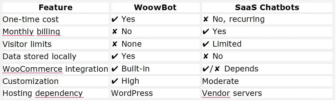 Compared to SaaS chatbots costing $30–$300/month per store, you save: